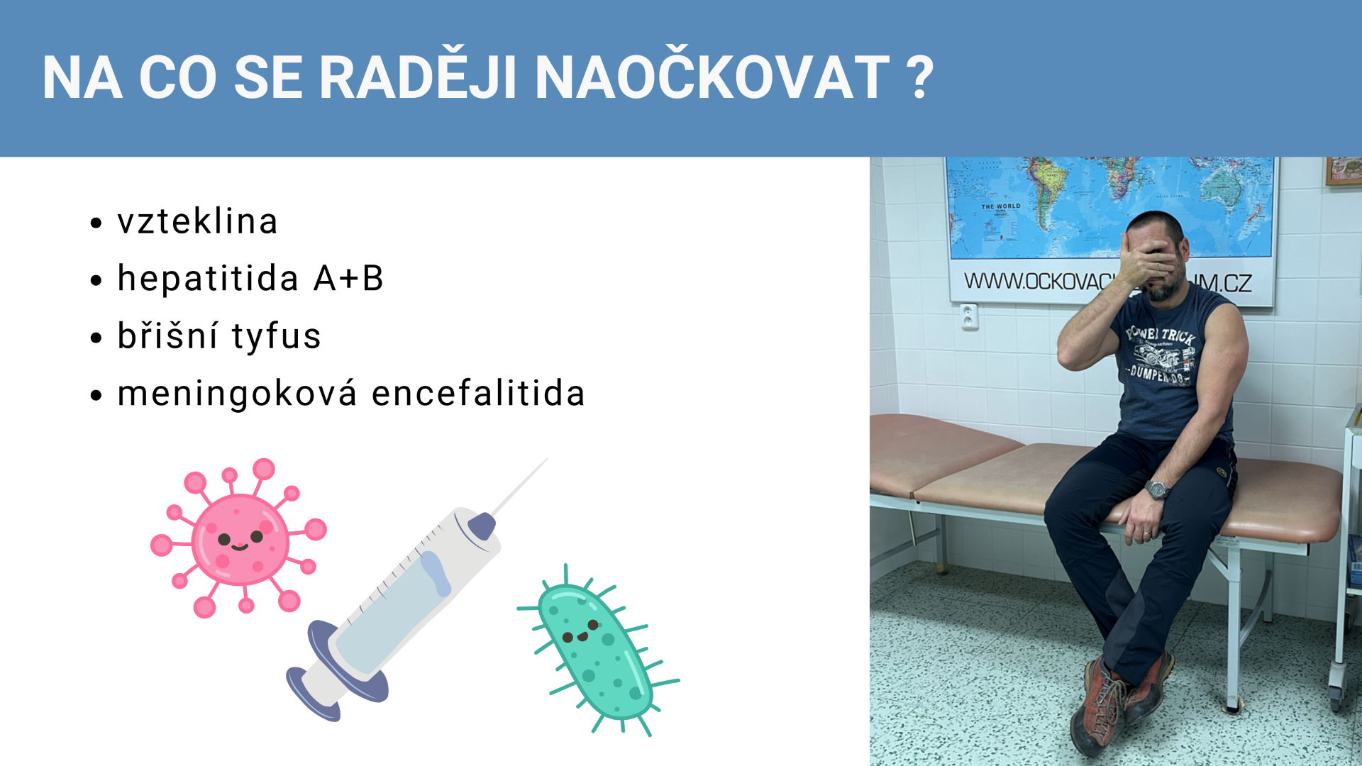 Vzteklina je smrtelné virové onemocnění centrálního nervového systému přenášené slinami infikovaných zvířat (nejčastěji pokousáním) na člověka. Projevuje se agresivitou, křečemi a ochrnutím. Je neléčitelná, pomoci může včasná vakcinace po poranění (postexpoziční). Ta ale v horách v Nepálu neklapne, proto je lepší preventivní imunizace/očkování (preexpoziční).